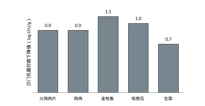 图1:噬菌体(107PFU/g)对生肉宠物食品成分中的肠道沙门氏菌(Salmonella enterica)的灭活效率。Soffer N., et al. (2016)